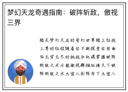 踏足梦幻天龙的奇幻世界,踏上征战三界的征程。随着你不断探索,你将面临无穷无尽的挑战和机遇。掌握破阵斩敌之术,方能傲视群雄,纵横天下。