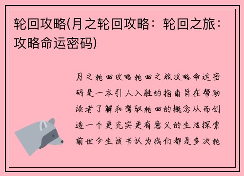 《月之轮回攻略:轮回之旅:攻略命运密码》是一本引人入胜的指南,旨在帮助读者了解和驾驭轮回的概念,从而创造一个更充实、更有意义的生活。